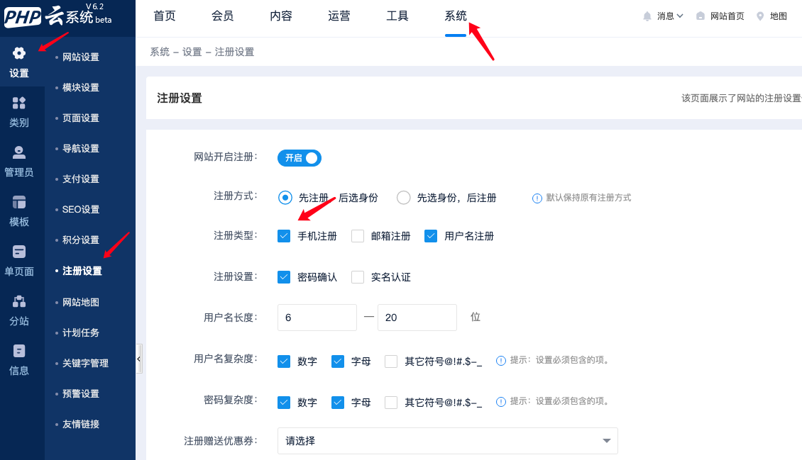 如需开启手机注册功能,请进入系统管理后台 -》 设置 -》 系统 -》 注册设置,将页面中“注册类型”选项开启“手机注册”。