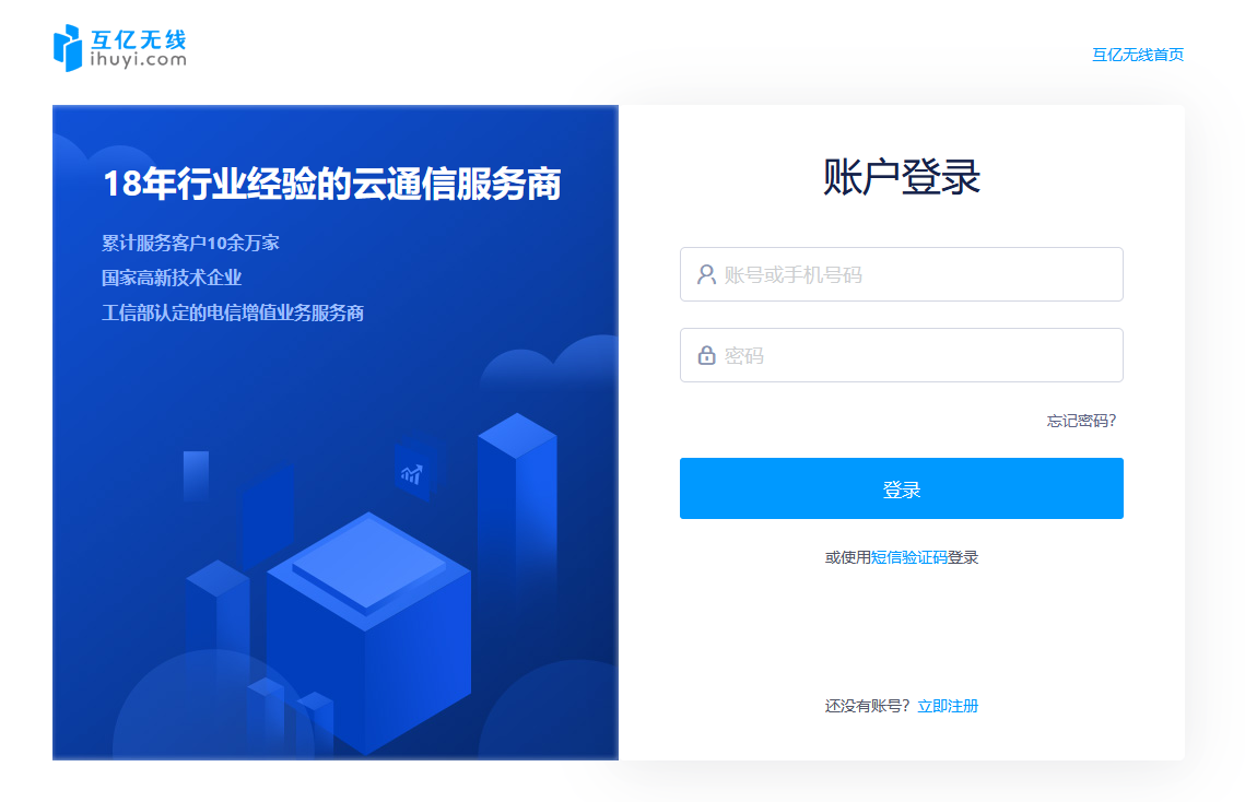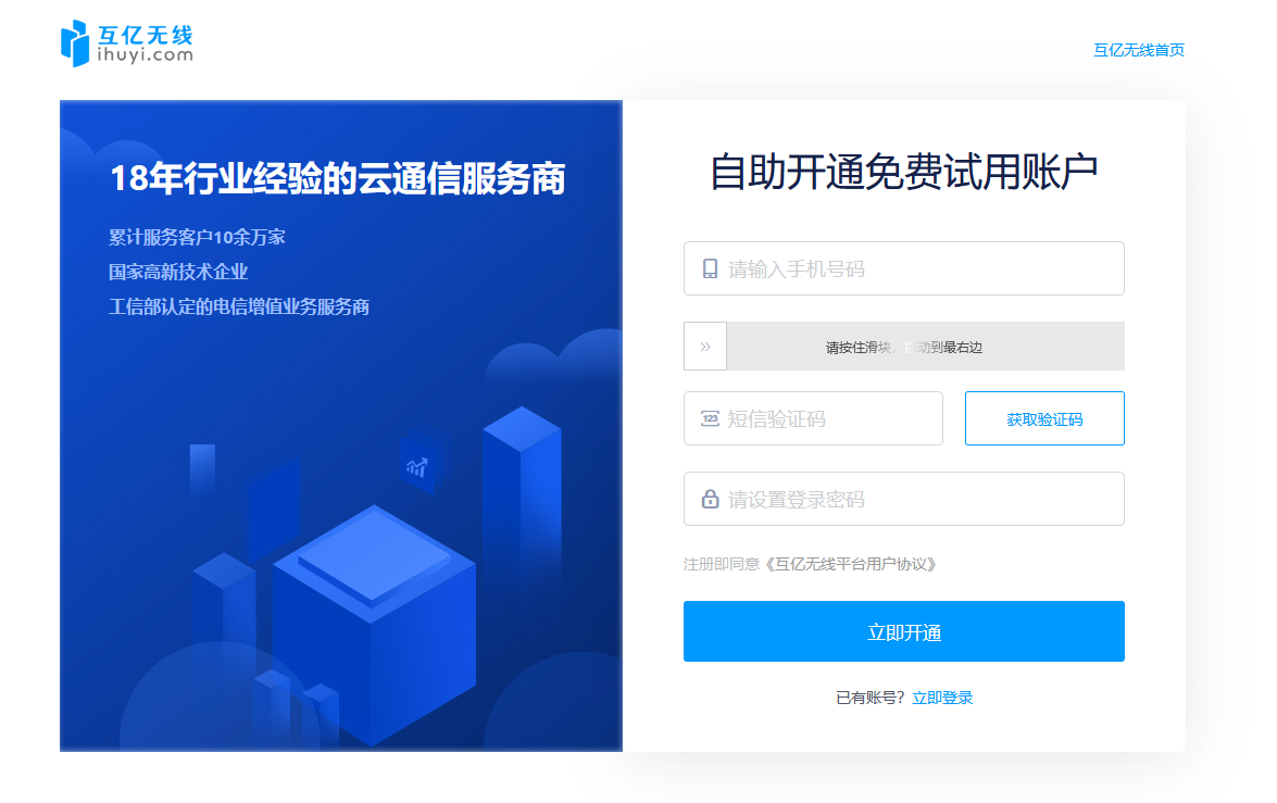 如您还没有互亿无线账号,请在登录界面,点击下方的“立即注册”按钮,免费开通一个新账号。