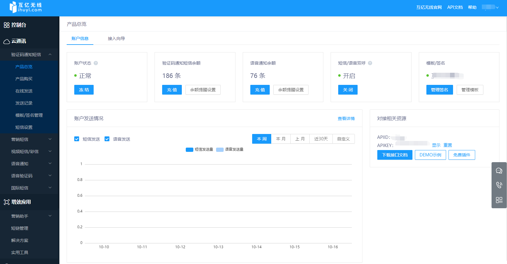 点击左侧菜单 “验证码通知短信 -》 产品总览” ,在右侧 “对接相关资源” 中获取短信发送使用的APIID和APIKEY。