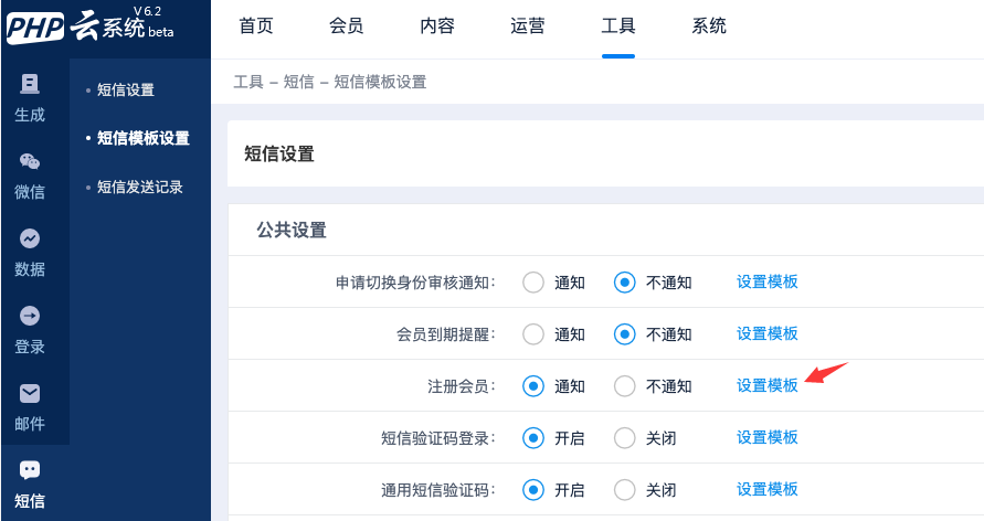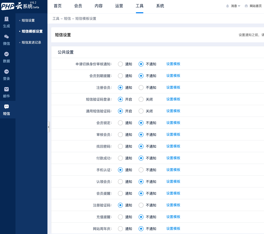 点击左侧菜单“短信 -》 短信模板设置”,在短信模板设置页面,将需要开通短信发送的场景,设置为“开启”或“通知”状态。