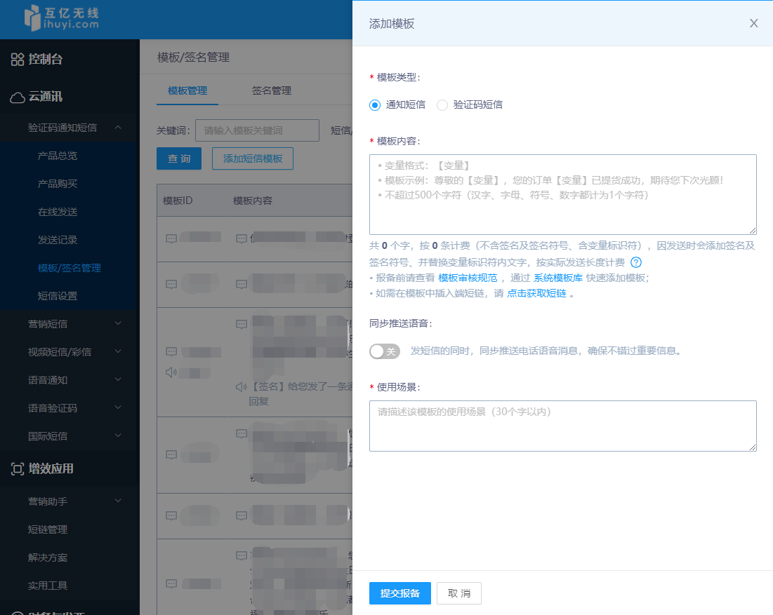 使用发送场景设置的模板内容,需要将短信内容在互亿无线短信平台中进行报备(报备前请先完成互亿无线短信平台的认证、充值等操作)。登录互亿无线短信平台,点击左侧菜单“验证码通知短信 -》 短信设置 -》 模板管理”,在模板管理页面,点击上方的“添加短信模板”按钮。