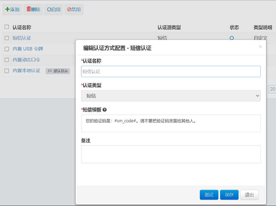 在系统管理中,点击进入短信认证配置页面,根据以下信息设置参数: