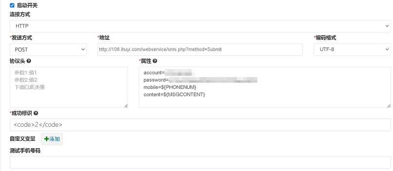 填写完成后,点击【测试】按钮,查看是否能正常的收到短信。