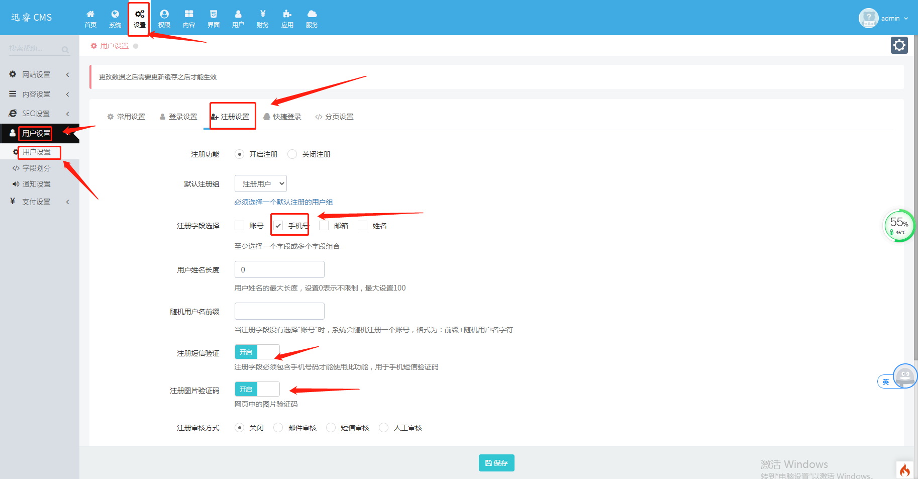 3、在设置->用户设置->用户设置->注册设置,在“注册字段选择”栏,勾选“手机号”后点击下方【保存】按钮。
