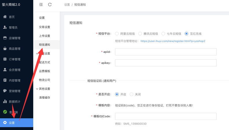 登录萤火商城商户后台,进入“设置 -> 短信通知”页面。