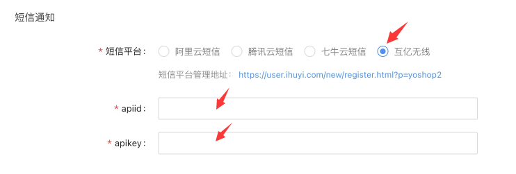 选择“短信平台”为“互亿无线”,并依次填写apiid及apikey信息。