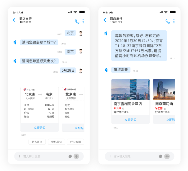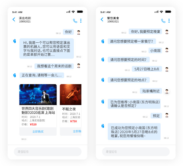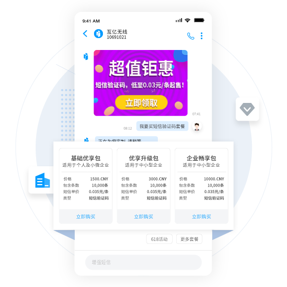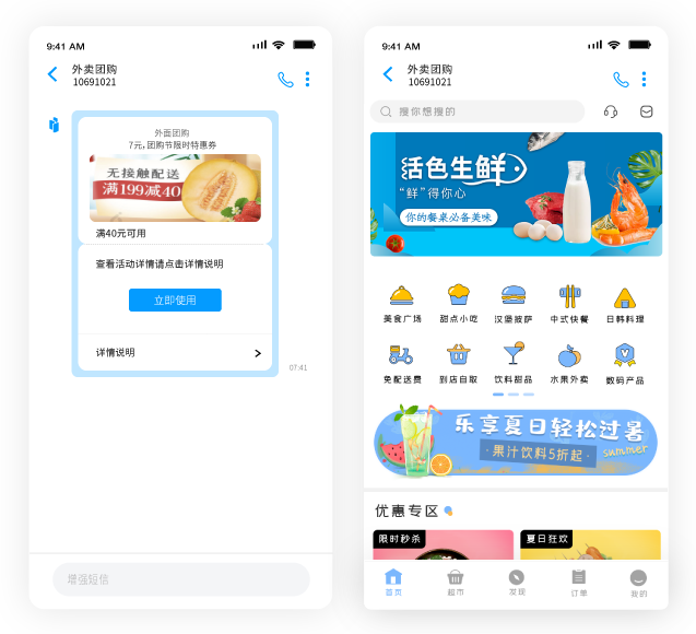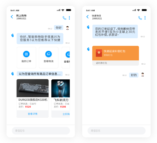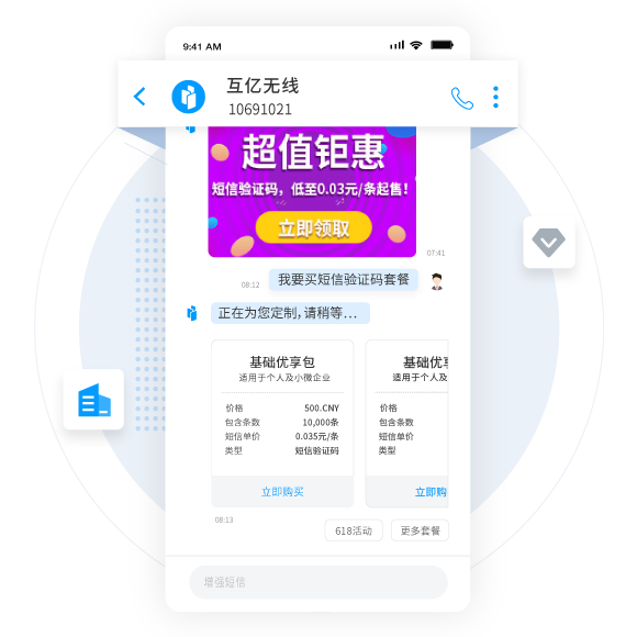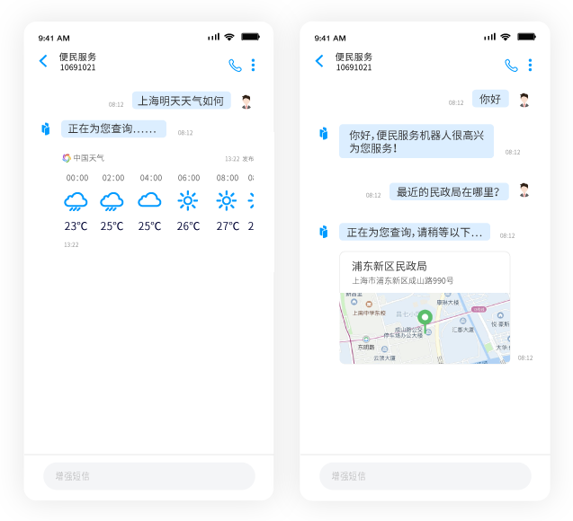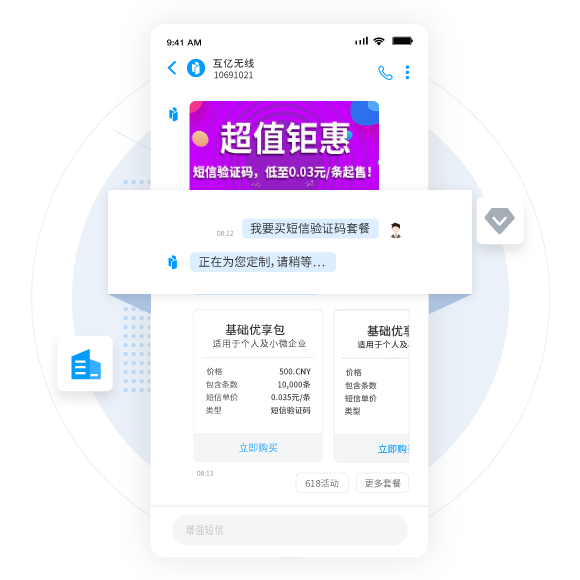 终端用户无需下载任何APP,即可通过传统手机短信入口享受5G消息服务。企业给会员用户发短信将不再支付短信费用,转而支付低廉的流量费,并支持文字、图文、视频、红包、位置、联系人、文档、图文卡片等更丰富的内容形式发送。同时,用户可以在短信界面中,和企业专属的服务平台像聊天一样完成对话,通过输入所需的服务,快速完成购买、订票、查快递、预定、充值等服务!