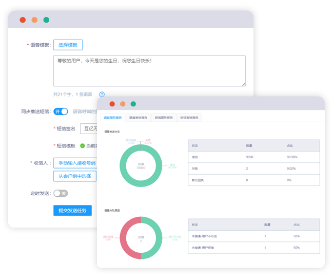 只需接入一个接口,即可拥有短信+语音双呼功能,且可自定义短信搭配的语音模板。